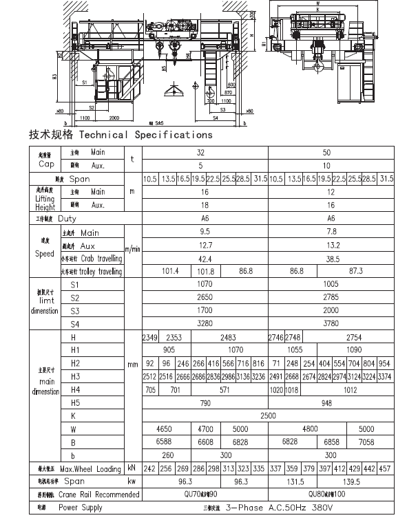 二、產(chǎn)品簡(jiǎn)圖及技術(shù)規(guī)格(QC32/5-50/10t)